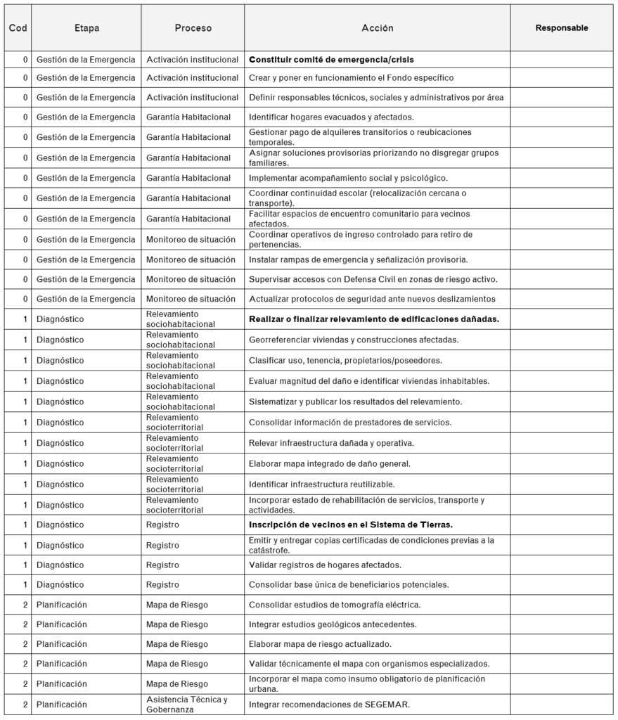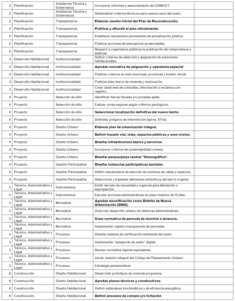 El primer conjunto de acciones define las condiciones básicas para la reconstrucción habitacional mientras aún se están desplegando operativos de mitigación y rehabilitación. En segundo lugar, las acciones referidas al plan de vivienda y reubicación, que se focalizan en la resolución de la problemática habitacional de las familias afectadas. En tercer lugar, se enumeran las acciones para el tratamiento del terreno impactado.