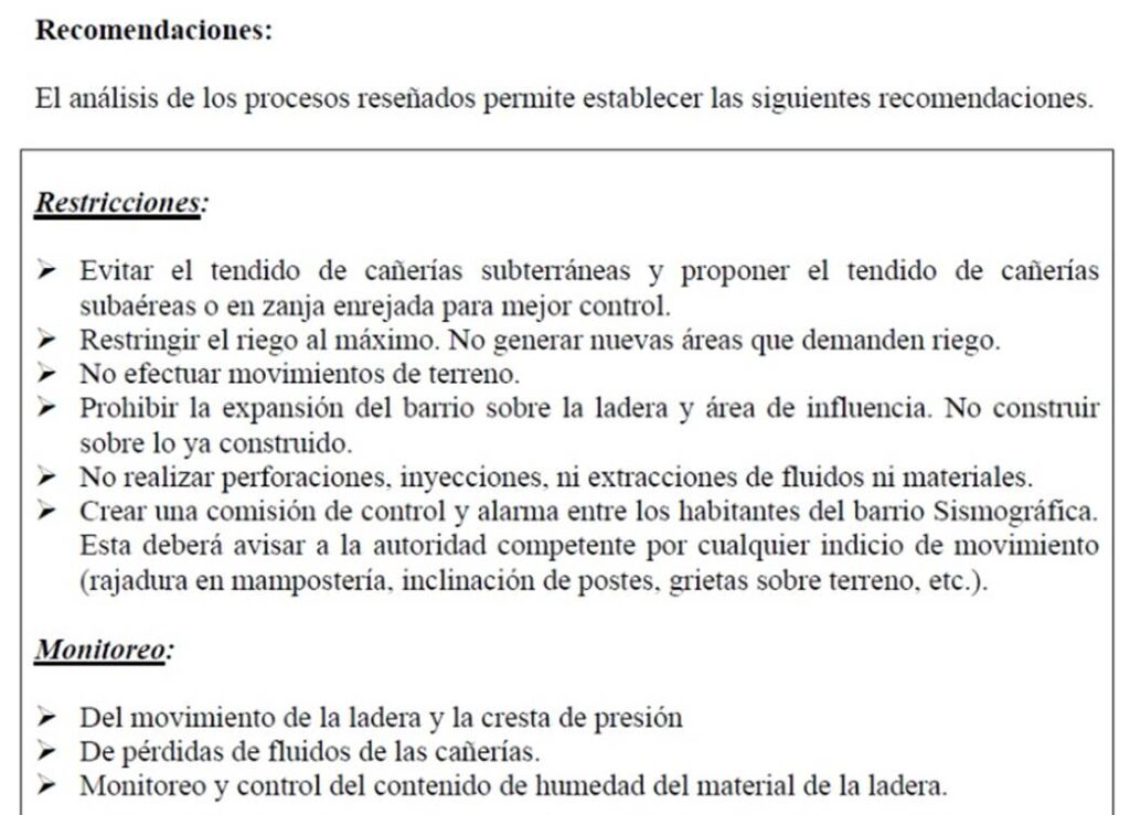 El informe afirma que es importante remarcar es que no es posible descartar una reiteración de los movimientos de ladera, con lo cual el municipio tendría la responsabilidad de establecer una red de monitoreo permanente de la ladera si continúa la expansión del barrio. Finalmente sería importante instruir a los vecinos del barrio sobre las características del sustrato sobre el que están asentando sus viviendas, a fin de que tomen conciencia de la peligrosidad y puedan de este modo, comprender la problemática vinculada a la ampliación del Barrio Sismográfica (pag. 3)