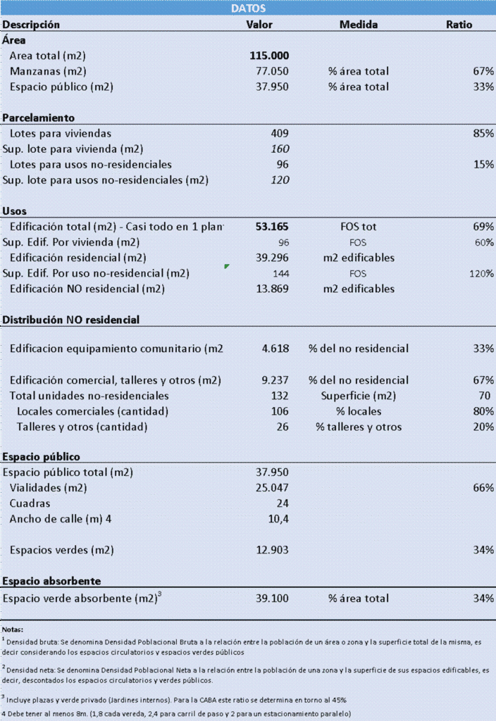 El cuadro presenta un modelo de urbanización parametrizado para dar solución habitacional adecuada a 380 familias. Como resultado general del cálculo, se requiere una superficie total de 115.000 m², organizado bajo un criterio de baja altura y predominio de la edificación en planta baja, lo que continúa con el patrón edilicio de los barrios originales y de la ciudad en general, orientado a la habitabilidad.