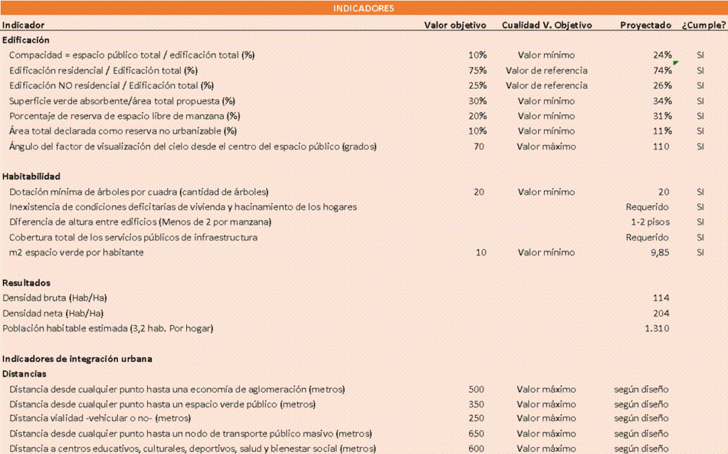 - Genera una compacidad corregida (balance entre espacio público y edificado) de 24%, frente a un valor mínimo recomendado de 10%.