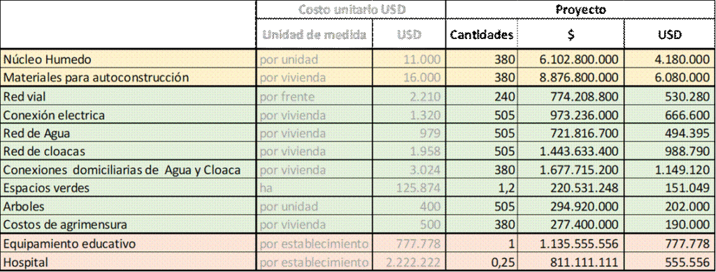 Estimando los costos de esta urbanización, se obtiene que la mayor proporción corresponde a la inversión en las viviendas, que implica $ 6102 millones para 380 núcleos húmedos, y $ 8876 millones en materiales para la construcción progresiva de la vivienda (se estiman 40m2 por vivienda).
