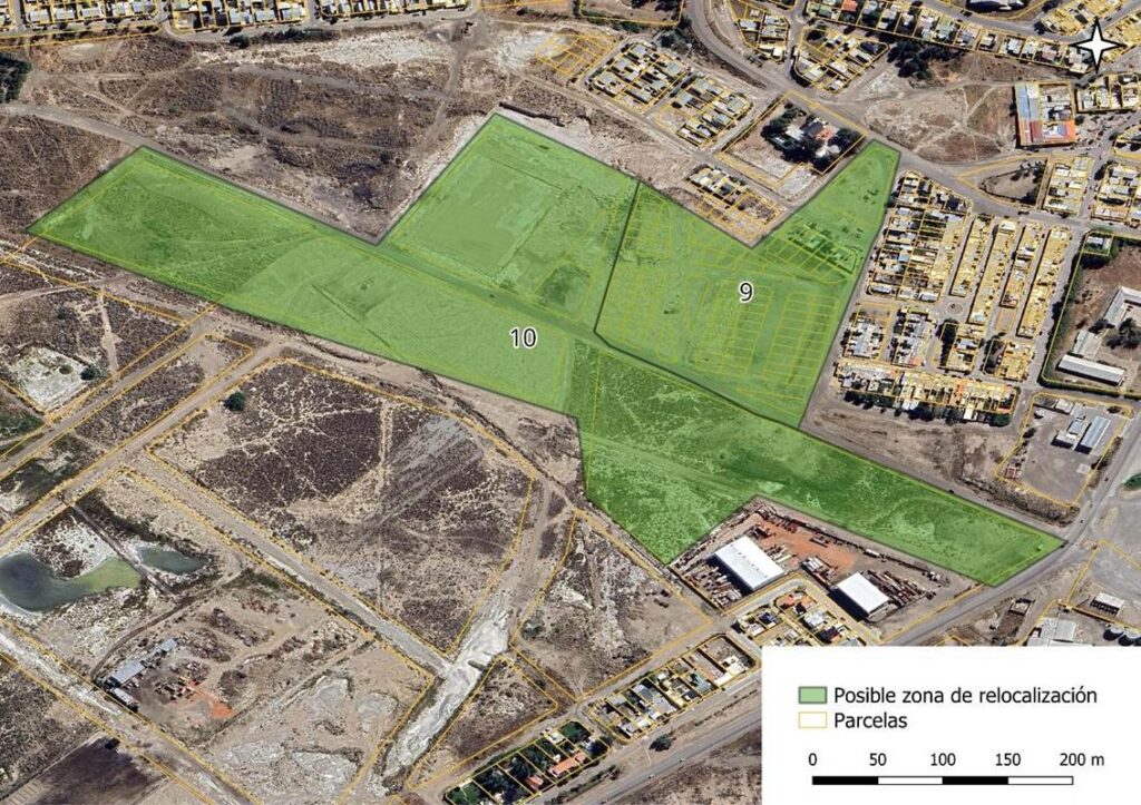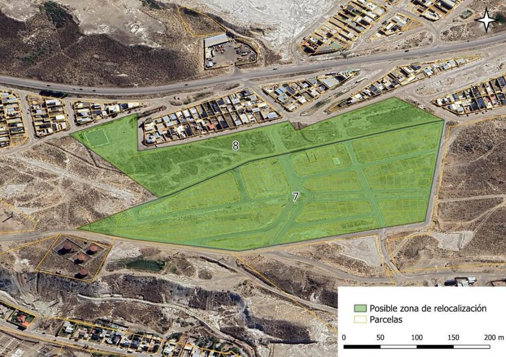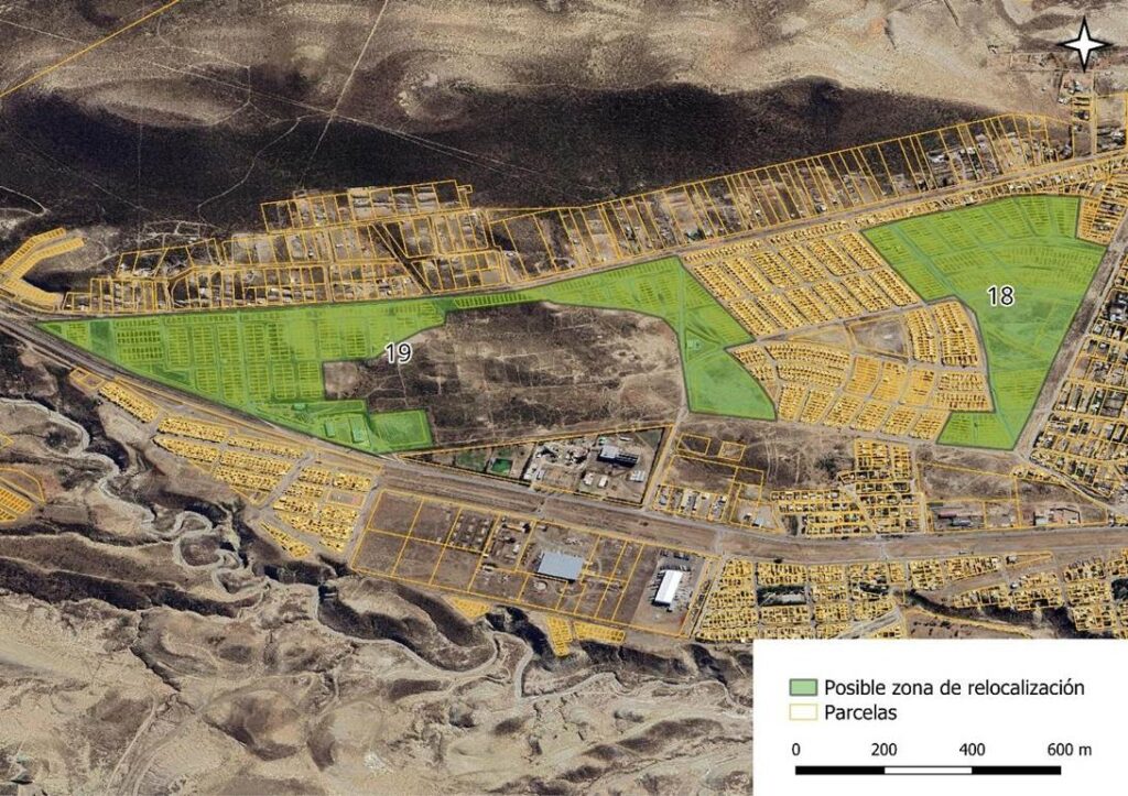 [7] Para definir las zonas que no cuentan con riesgo aparente, se utilizaron mapas de referencias bibliográficas, identificación de pendientes según información satelital, y de pozos petroleros que fuesen claramente reconocibles con estas herramientas. Para delimitar la zona urbana o en proceso de urbanización se utilizó el relevamiento de expansión realizado por Tejido Urbano en 2025, y el límite urbano definido por la propuesta de Código urbanístico (Secretaría de Planificación Territorial y Coordinación de Obra Pública en 2019). (No se pudo conseguir el plano digital de zonificación del código actual). Se utilizó la digitalización del catastro publicado por la provincia de Chubut a fin de reconocer el parcelamiento existente. A partir de la interpretación de información satelital (Google Earth) también se identificaron predios preferentemente cercanos a vías de comunicación, transporte público, zonas comerciales, barrios ya desarrollados, y cercanía a equipamientos comunitarios.